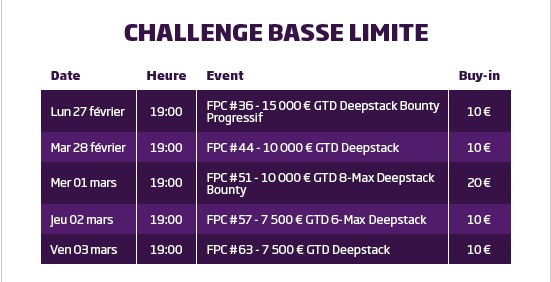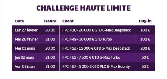 Pour cela, il a choisi 2 tournois par soir, un comptant pour le « Challenge Basse Limite » et le second comptant pour le « Challenge Haute Limite ». A l’issue de chaque tournoi et en fonction de votre position finale, vous gagnez des points vous permettant de figurer dans le classement « Basse limite » et « Haute limite »