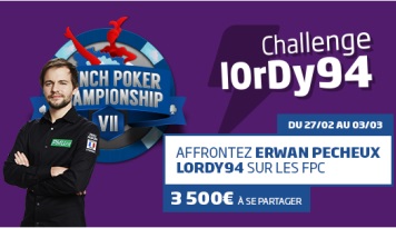Envie de vous frotter à la crème du poker français en tournoi ? PMU Poker lance un challenge aux joueurs, celui de battre Erwann Pécheux durant 5 jours sur les prochains events des FPC VII. Et afin de vous motiver, 3500€ seront mis en jeu !