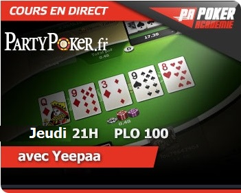 Yeepaa vous donne rendez-vous ce jeudi 5 juin à 21h sur la livezone de Poker-Académie pour un cours de PLO100. Pour l'occasion, le coach expert en omaha vous a préparé 11 mains dans le replayer PA abordant des thèmes clefs du jeu PLO. Bon cours à tous !