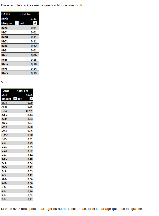 On préfère bet un KK plutôt que AA, car quand on check AA la proba de ce faire bet et plus élever, AA bloque plus de Calling range que KK, et KK bloque plus de folding range que AA, et quand on se fait raise 3 barelle on préfère call avec KK plutôt que AA, car trop mauvais blocker