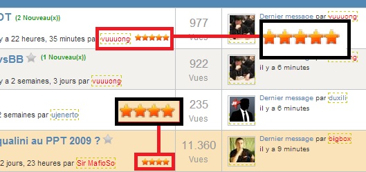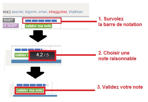 Dorénavant tous les sujets présents sur le forum peuvent être notés par les membres PA. Pour cela il vous suffit d’aller sur le sujet en question et d’aller en haut à droite où vous pourrez renseigner une note de 0 à 5. Il vous suffit ensuite de cliquer sur valider ma note pour que celle-ci soit prise en compte.