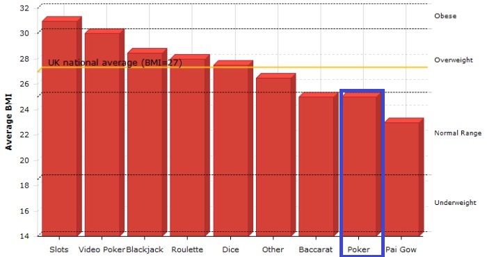 Juste au dessus du poids de forme avec un IMC de 25 (indice de masse corporelle), et en dessous de la moyenne nationale, le joueur de poker est celui qui se comporte le mieux par rapport aux autres "gambler".