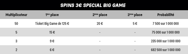 Les jours 1 vous permettront de vous qualifier pour le jour 2 qui aura lieu le 10 Août à 21h. Pour vous qualifier dès maintenant, des Spins spéciaux Big Game sont mis en place à 3€ pour gagner le précieux ticket d’entrée à 125€ pour ce tournoi.
